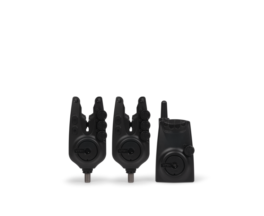Zestaw sygnalizatorów brań VTX+ na dwa wędziska – zawiera dwa sygnalizatory i centralkę, zamykane sztywne etui, smyczkę do centralki oraz śrubokręt.