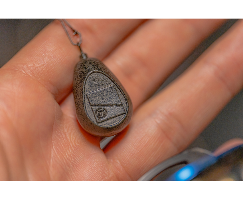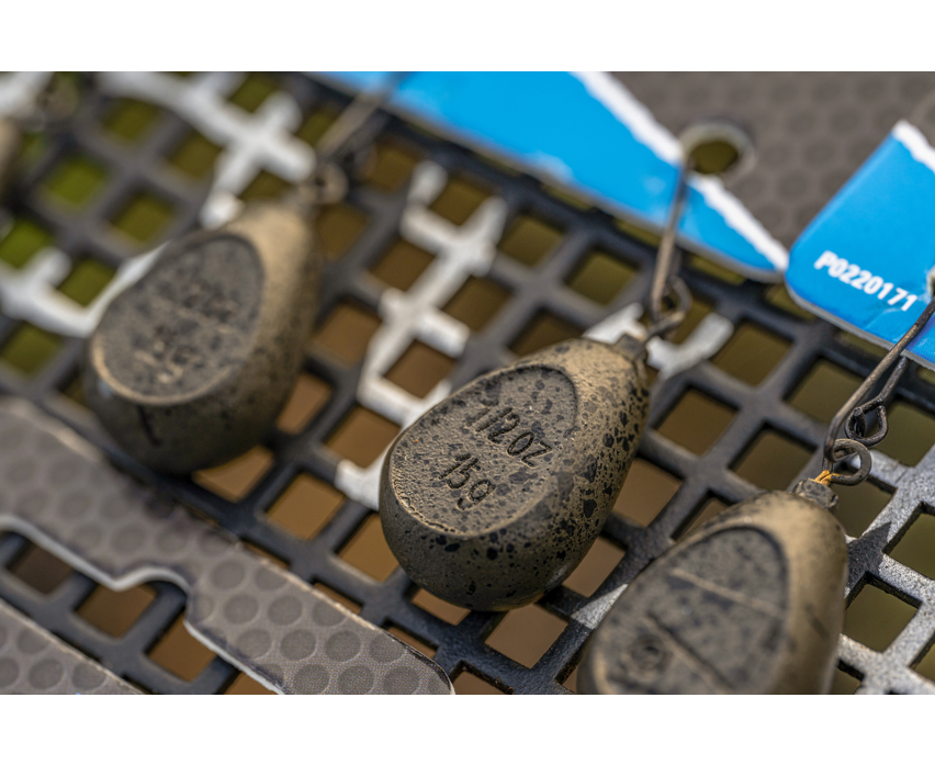 Aerodynamiczne, powlekane ciężarki w kształcie spłaszczonej gruszki, z krętlikiem Preston Flat Pear Leads . Celnie latają nawet w trudnych warunkach.